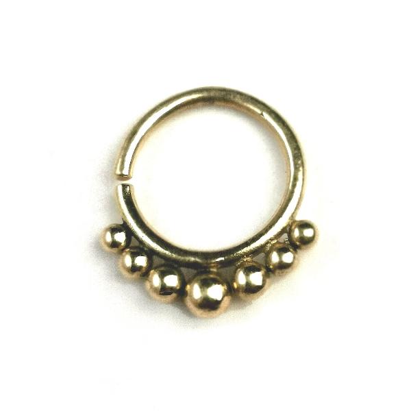 Wonderfully handcrafted 14k yellow gold septum ring made with a traditional tribal design with, adorned with 7 beautiful golden balls. Solid gold is a beautifully sensitive metal which is gentle on your skin and can be polished to keep that shine forever.
