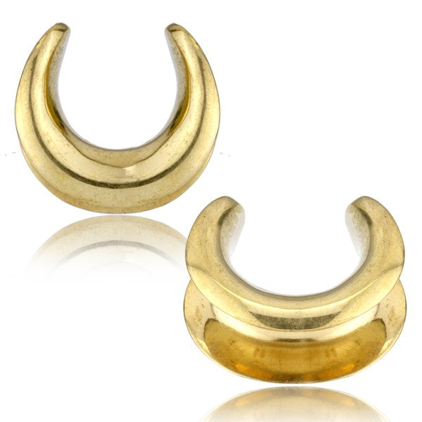 Golden brass horseshoe shaped saddles for stretched lobes. These gauges offer a different style than standard tunnels or plugs. Due to the ergonomic shape are extremely comfortable for you stretched lobe beauties to wear! Earrings including heavy ear weights can rest perfectly on these.