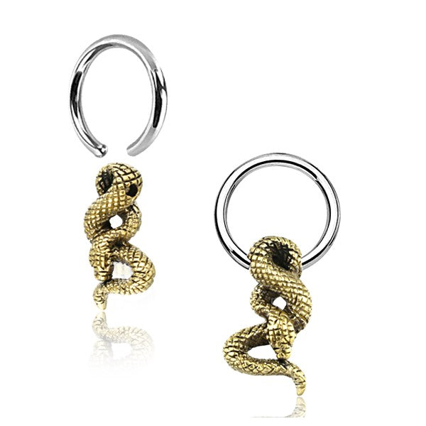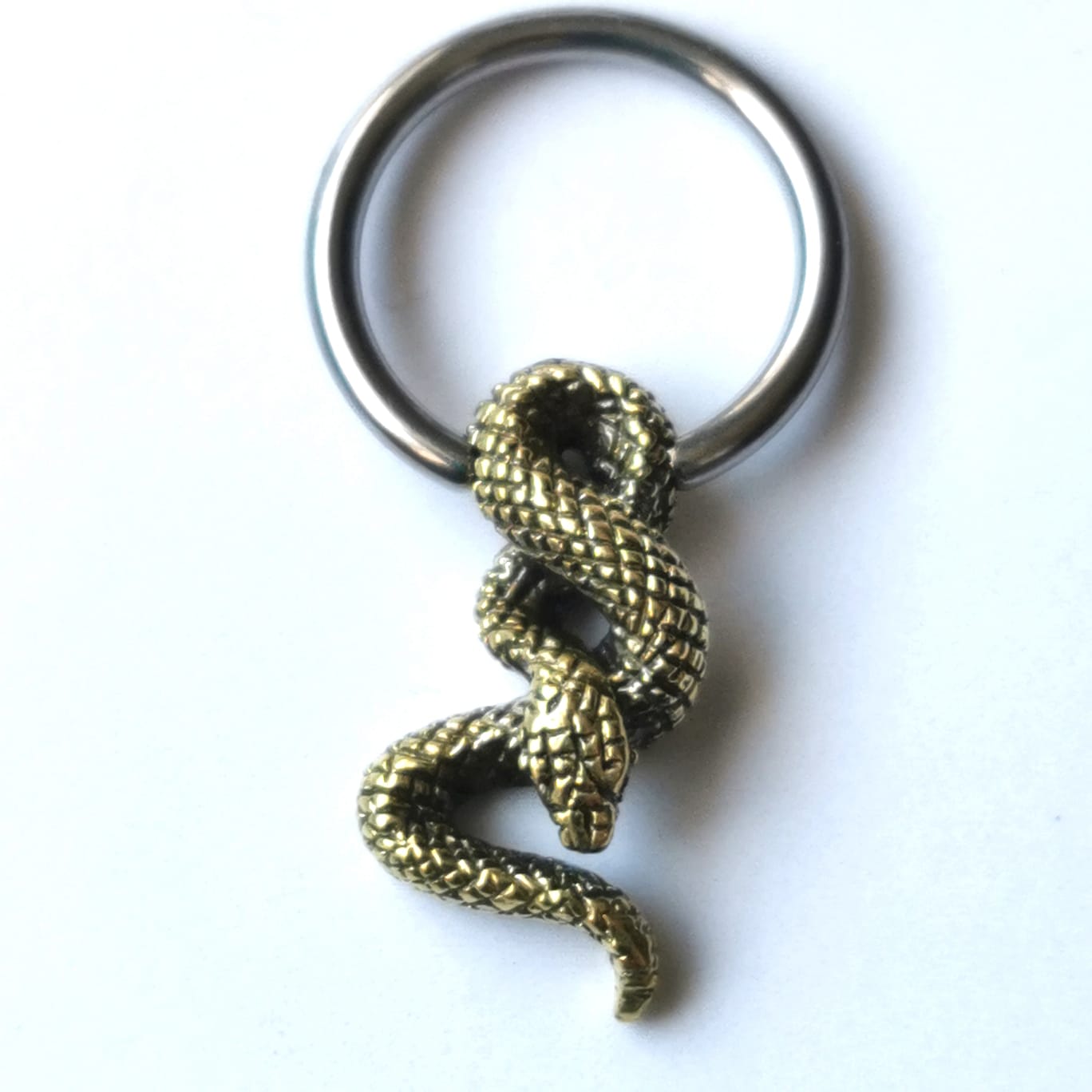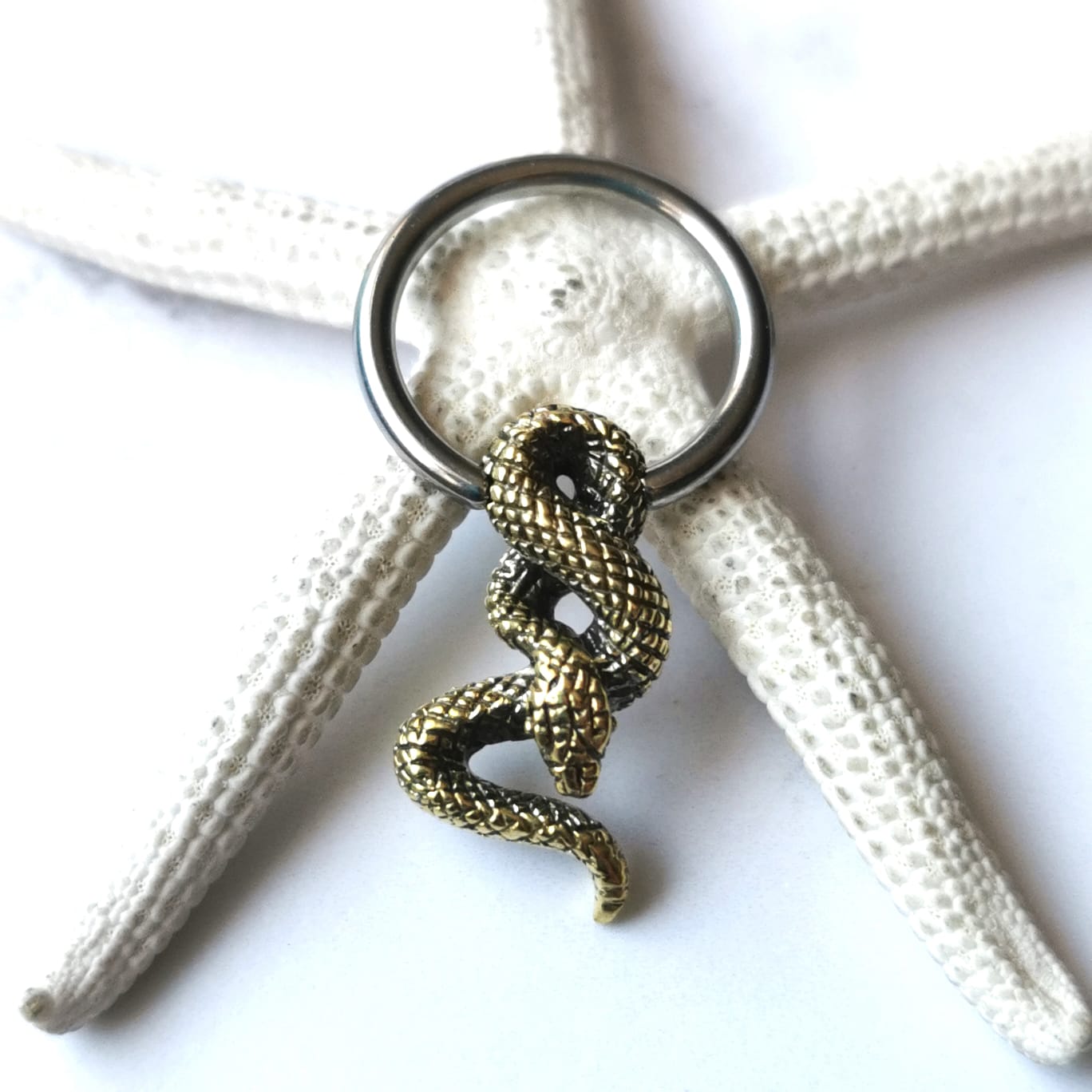 Silver colour stainless steel body jewellery ring with a stunning snake design made of golden brass. A smooth ring which opens easily by un-clipping the main brass charm, leaving a segment to fasten easily to a facial/ear or body piercing.These can be worn as septums, nipple jewellery eyebrow rings or any ear jewellery.