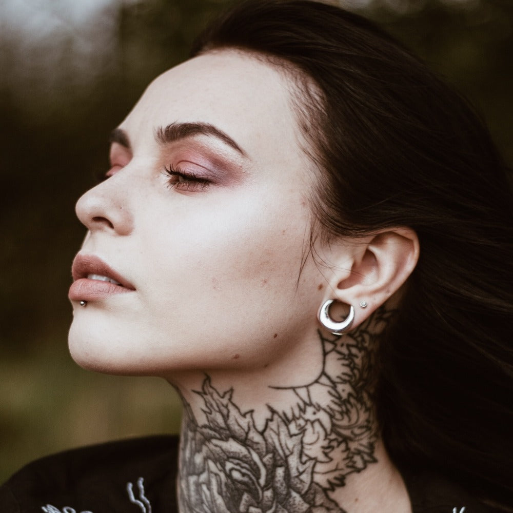White brass horseshoe shaped saddles for stretched lobes. These gauges offer a different style than standard tunnels or plugs. Due to the ergonomic shape they are extremely comfortable for you stretched lobe beauties to wear! Earrings including heavy ear weights can rest perfectly on these. You can wear these either smaller than your stretched ear size and rest them in the hole or the same size. Either way looks incredible.